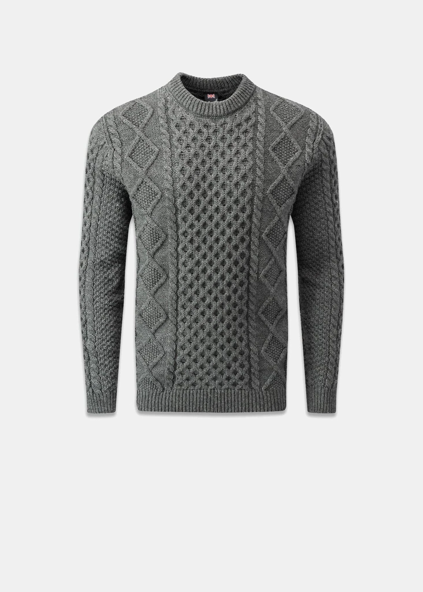 Fashioned from 100% 5 gauge British merino wool, this regular fit cable knit Aran jumper is made in England.