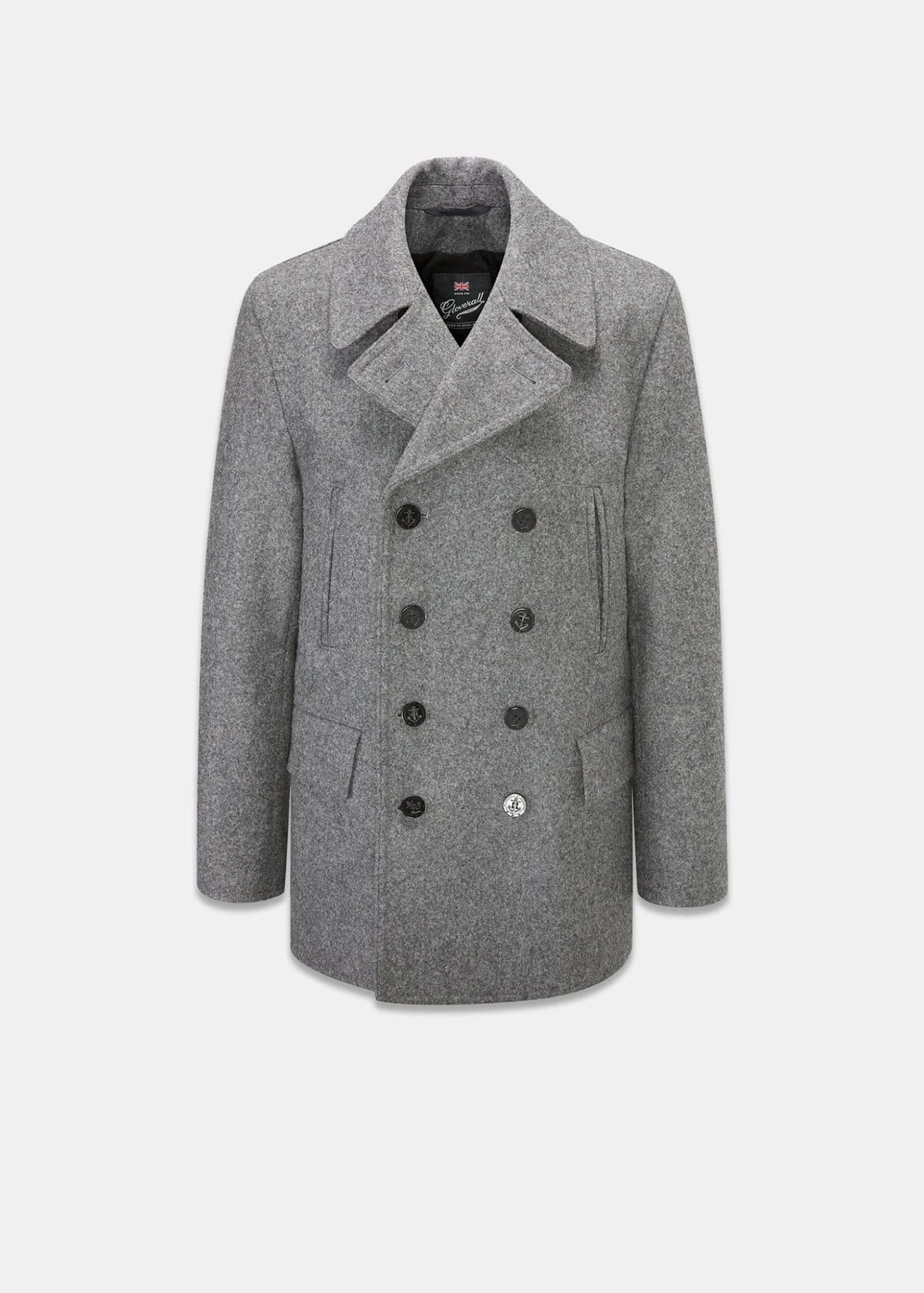 This double-breasted coat is finished with embossed buttons sporting the brand name alongside an anchor motif, in a nod to the naval origins of the style.