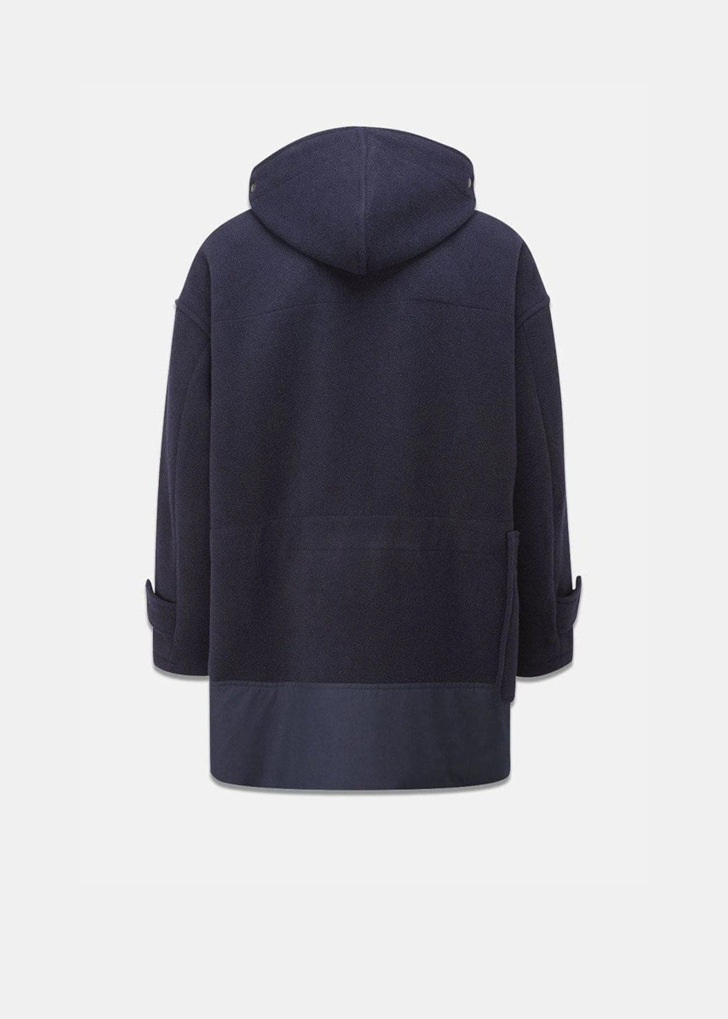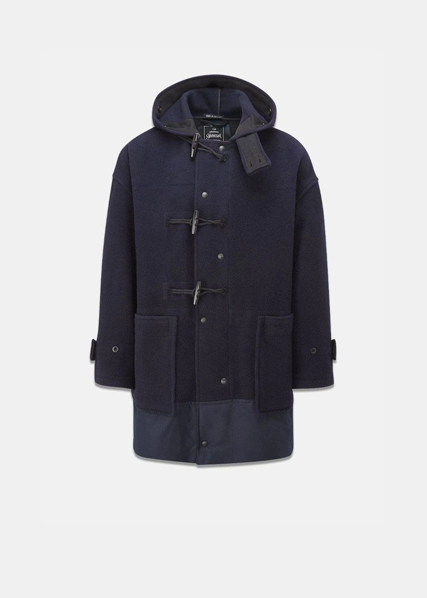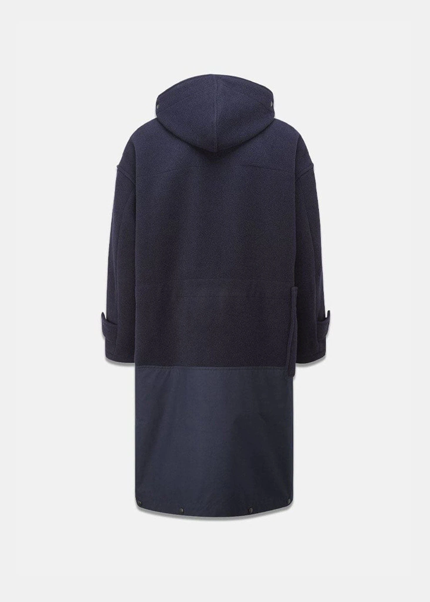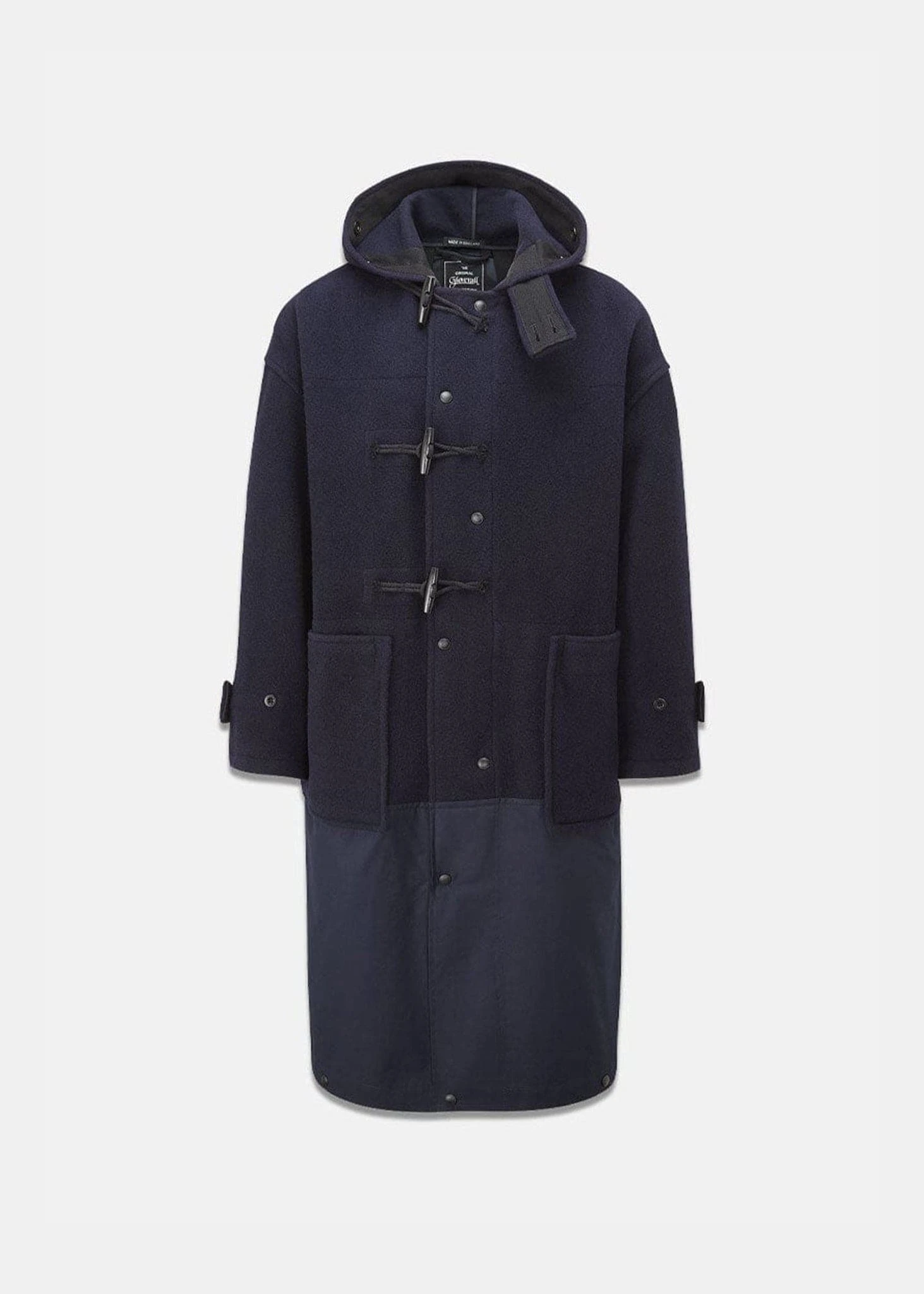Crafted from signature Gloverall boiled wool paired with a contrasting lightly waxed cotton, this relaxed style features all black trims for a sleek take on the classic duffle codes. Engineered Garments’ aesthetic and high-level detail is seen in the exposed press studs along the hood and length of the coat which offers the versatility to secure the extendable lower contrast panel at knee length or release it for a longer length.
