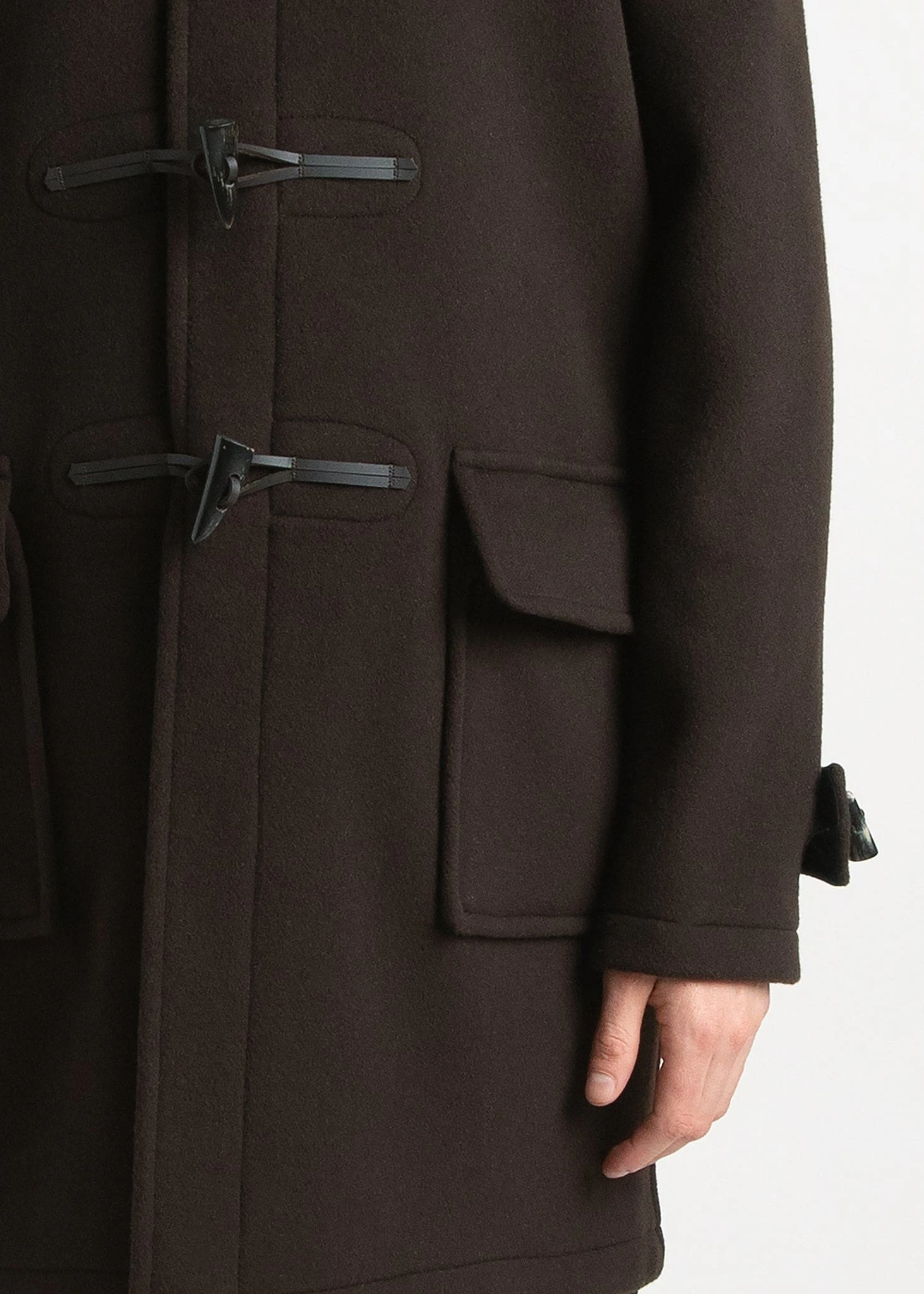 On sunny afternoons, leave the hood down to flash the tartan check interior of this coat’s double-faced cloth, made from a rich blend of Italian wool. Buffalo horn toggles add a sophisticated finish to the design, along with soft leather loop fastenings. Cold weather poses no problem in this Morris duffle, thanks to the added warmth of a fixed shoulder cape.