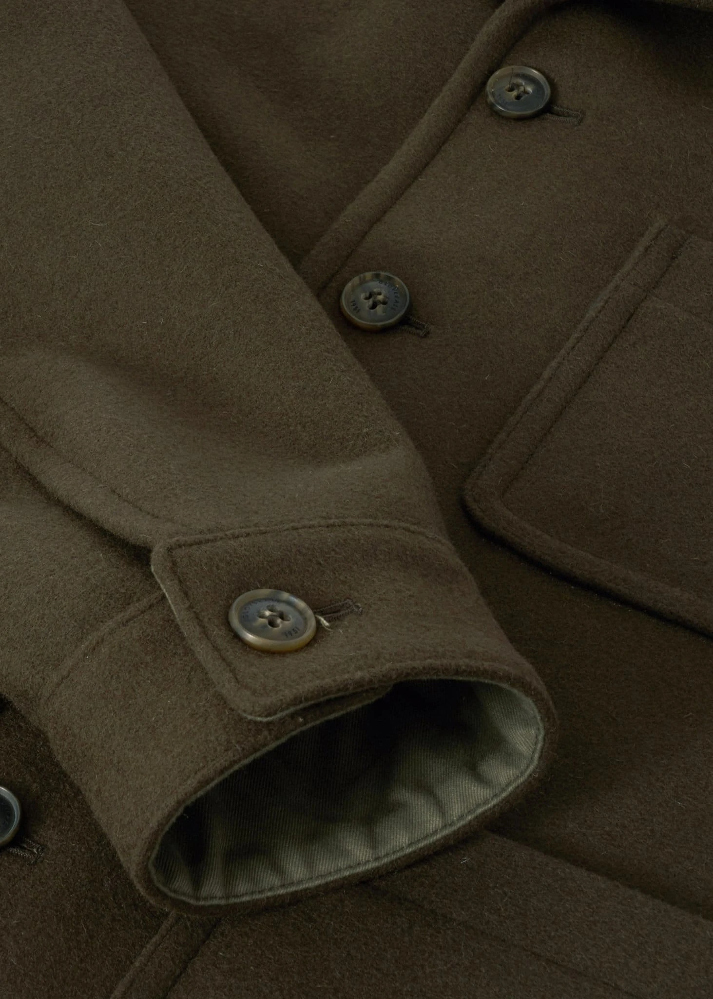 Designed in an Italian wool Melton cloth, the inner of this jacket is carefully finished with fully bound seams, and features large patch pockets. Finished with a contrast colour detail under the collar.