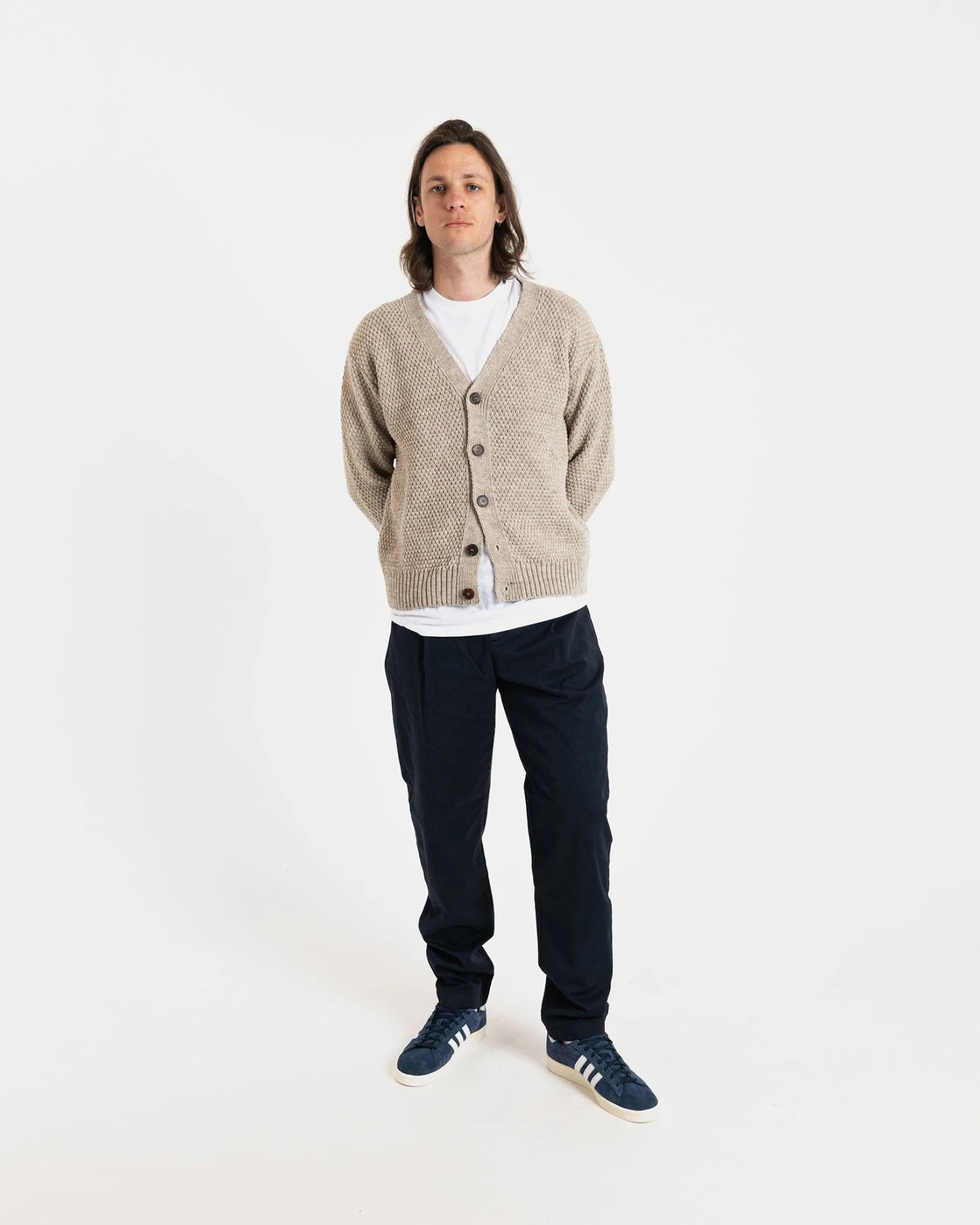 Designed for a streamlined look and comfortable layering, our Moss Stitch Cardigan will become your go-to outerwear piece. Made in England from 100% Merino Wool, the cardigan features classic horn buttons and a chunky gauge knit design.