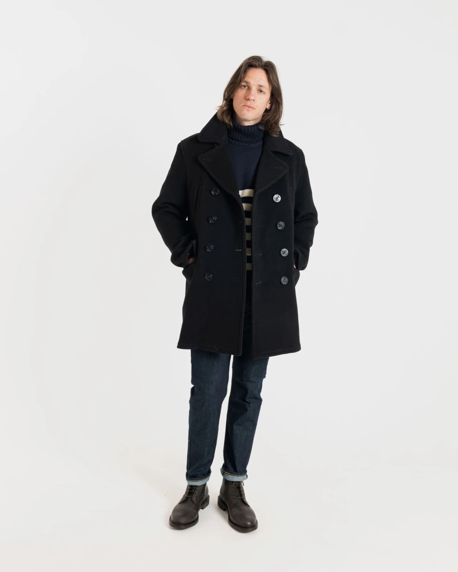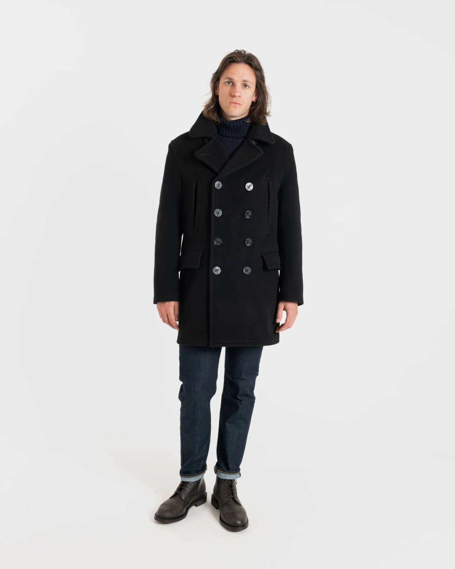 Made in England from a wool blend, our Oversized Peacoat is the perfect layering piece to compliment your outfit. Featuring a classic and timeless design, this double-breasted coat is complete with two angled side pockets, two front flap pockets, and anchor button fastenings.